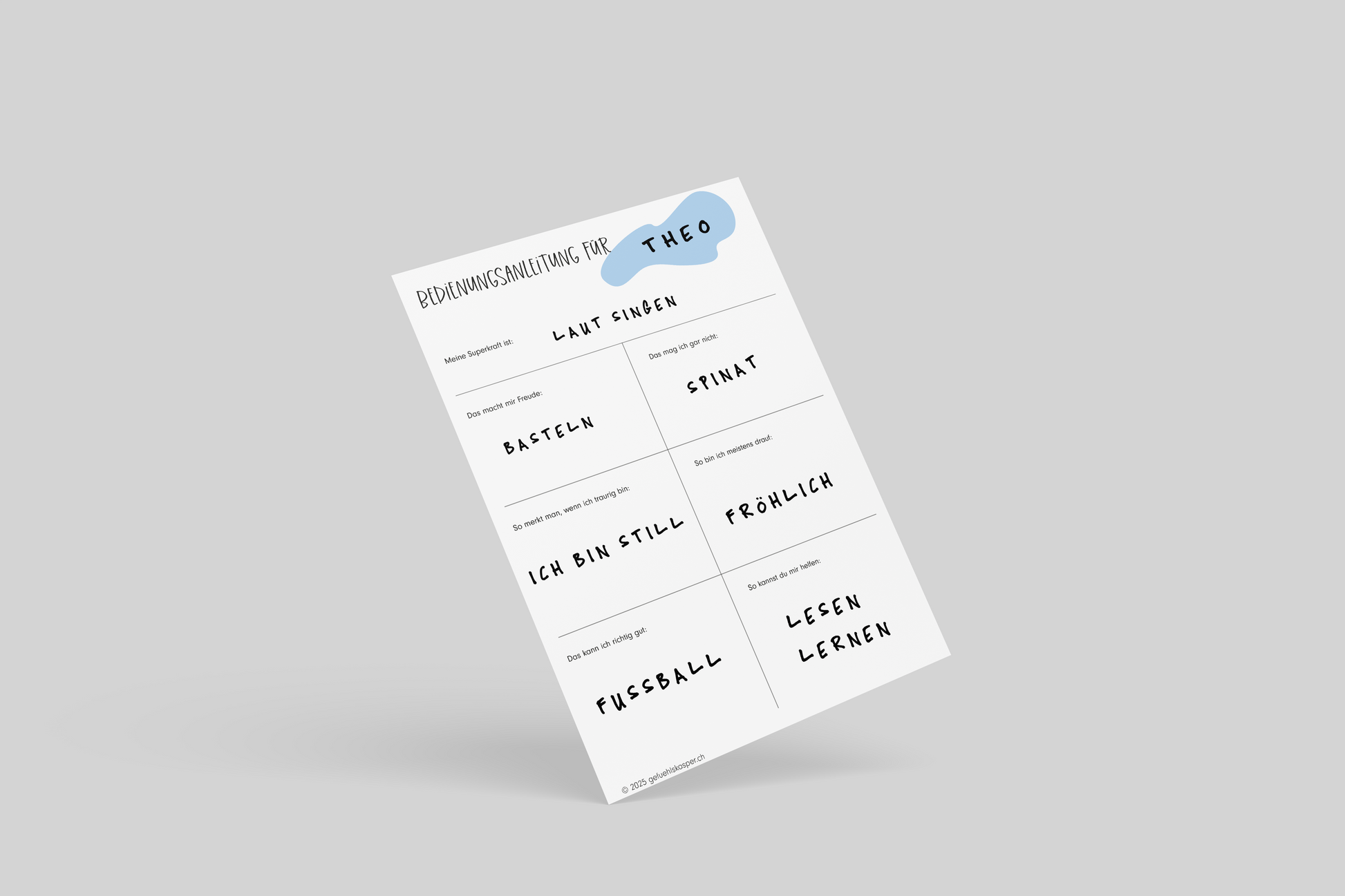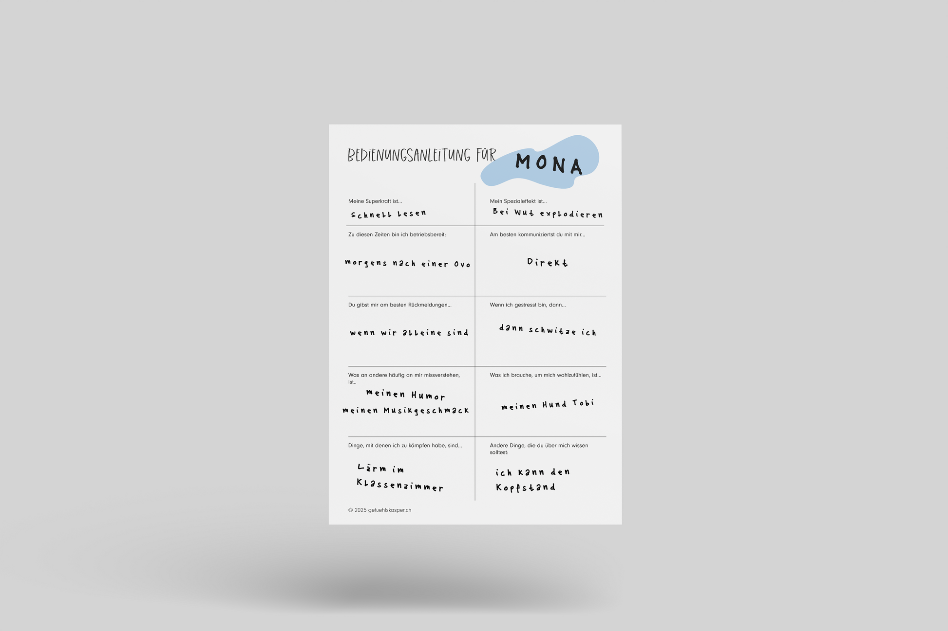 Mit der GefühlsKasper Bedienungsanleitung können Menschen auf einfache und kreative Weise erzählen, was sie bewegt. Sie füllen die Vorlage selbst aus – mit Zeichnungen, Worten oder Symbolen. So entsteht ein persönlicher Steckbrief, der Lehrerinnen, Teamkolleg:innen, Eltern, Geschwistern oder Freunden zeigt, wie man mit ihnen am besten umgeht.